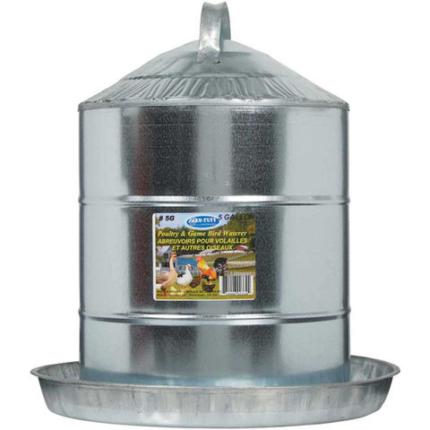 Made of galvanized steel, this poultry fountain has a durable design and resists corrosion to make it a great choice for your farm. Features a unique double-wall design. The joints are rolled rather than soldered to create tight-fitting seams and ensure safety. The fountain has a cone-shaped top to prevent roosting and the lid lifts off for easy access.